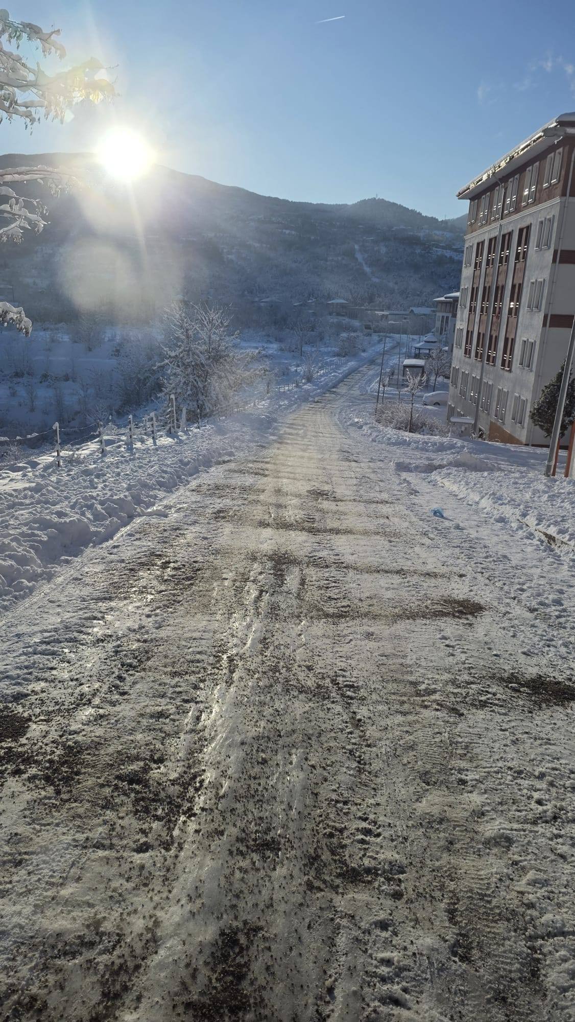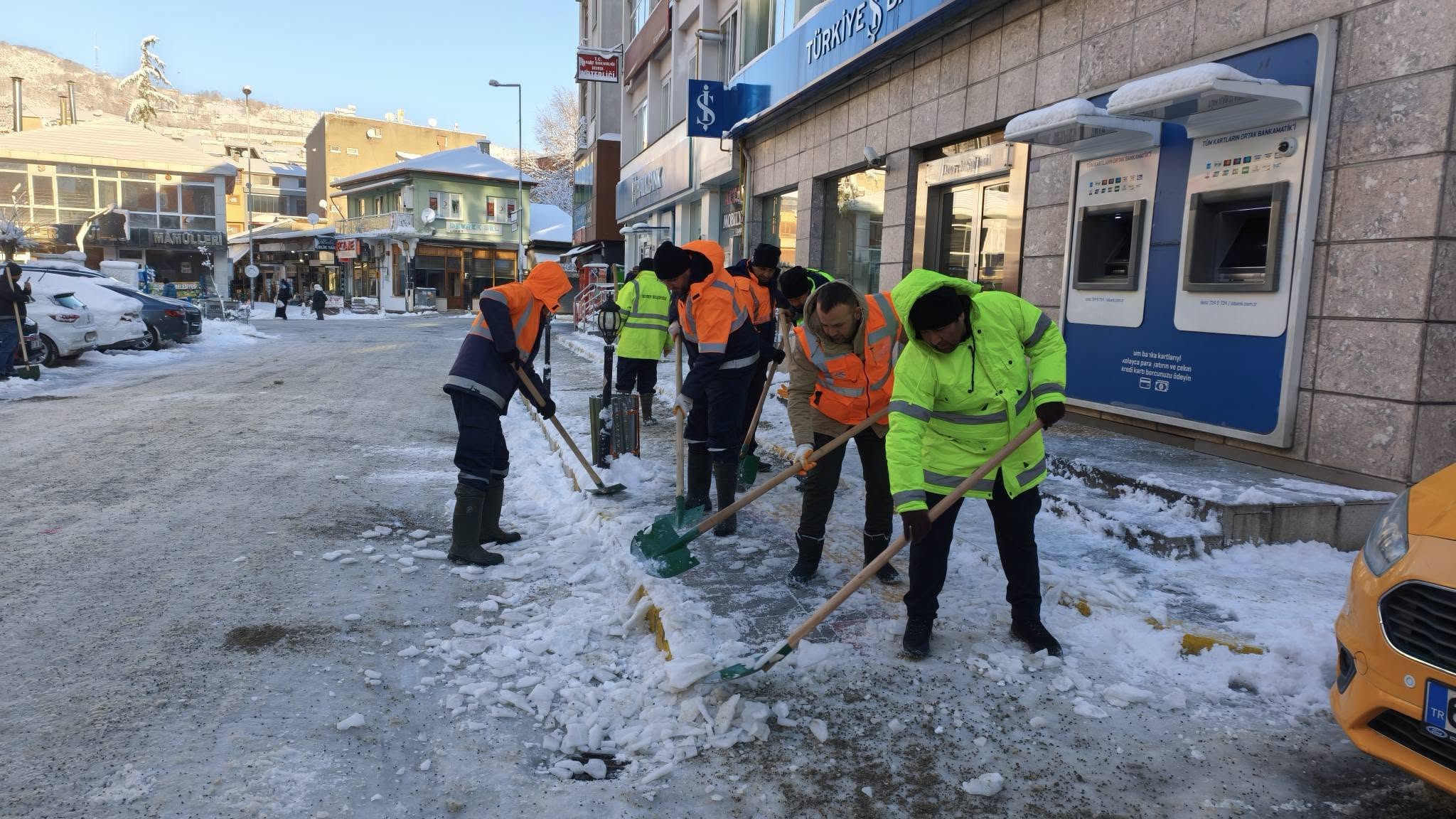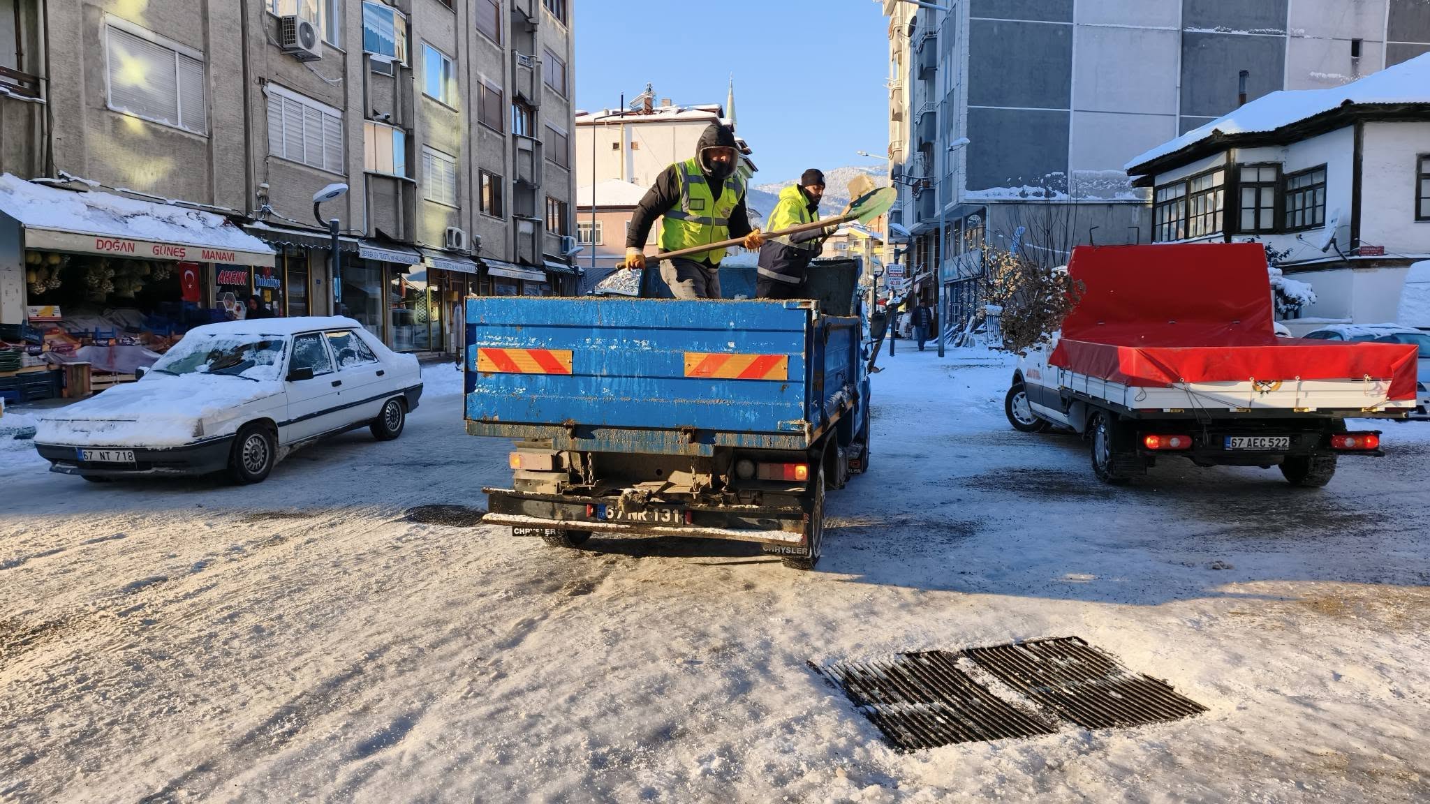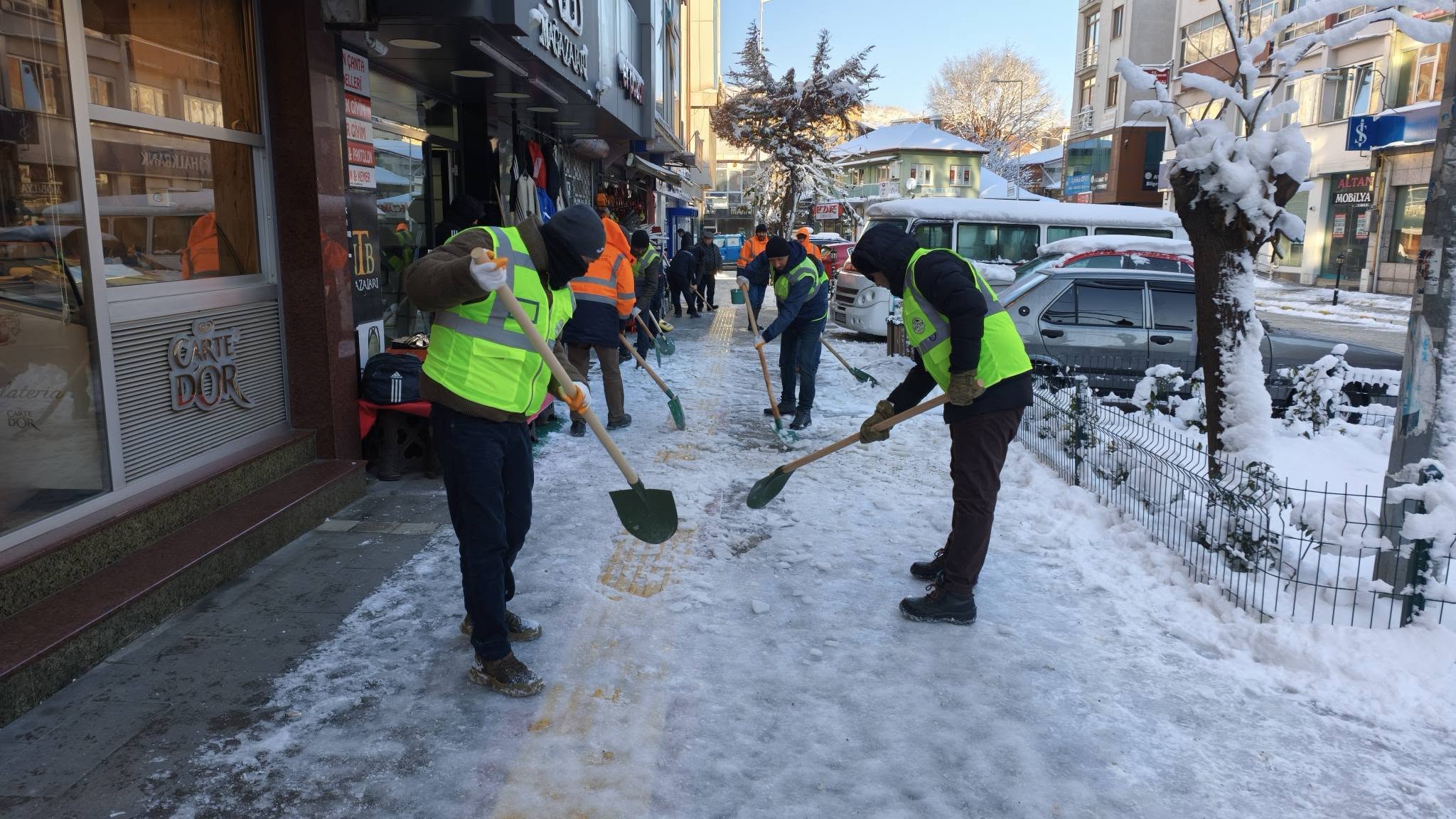 Yollar buzlanmaya karşı tuzlanırken, belediye ekipleri kaldırımlarda kar temizliği çalışmaları yapıyor.