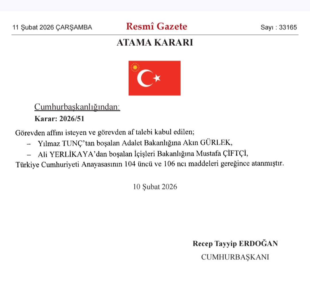 Resmi Gazetede yayınlanan atama kararında Adalet Bakanı Tunç ile İçişleri Bakanı Yerlikaya'nın görevden aflarını istedikleri belirtildi.