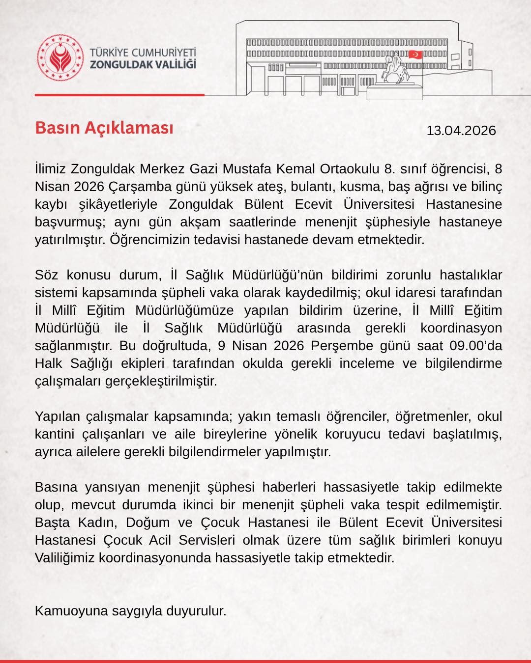 Zonguldak Valiliği, Zonguldak Gazi Mustafa Kemal Ortaokulu’nda bir öğrencide görülen menenjit vakasıyla ilgili açıklama yaptı.